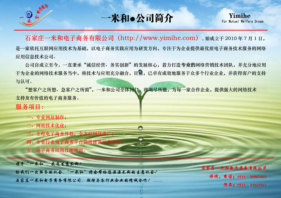 石家莊一米和電子商務(wù)有限公司(http://www.42390.cn),始成立于2010年7月1日,是一家依托互聯(lián)網(wǎng)應(yīng)用技術(shù)為基礎(chǔ),以電子商務(wù)實(shí)踐應(yīng)用為研發(fā)方向,專注于為企業(yè)提供優(yōu)質(zhì)電子商務(wù)技術(shù)服務(wù)的網(wǎng)絡(luò)應(yīng)用信息技術(shù)公司。